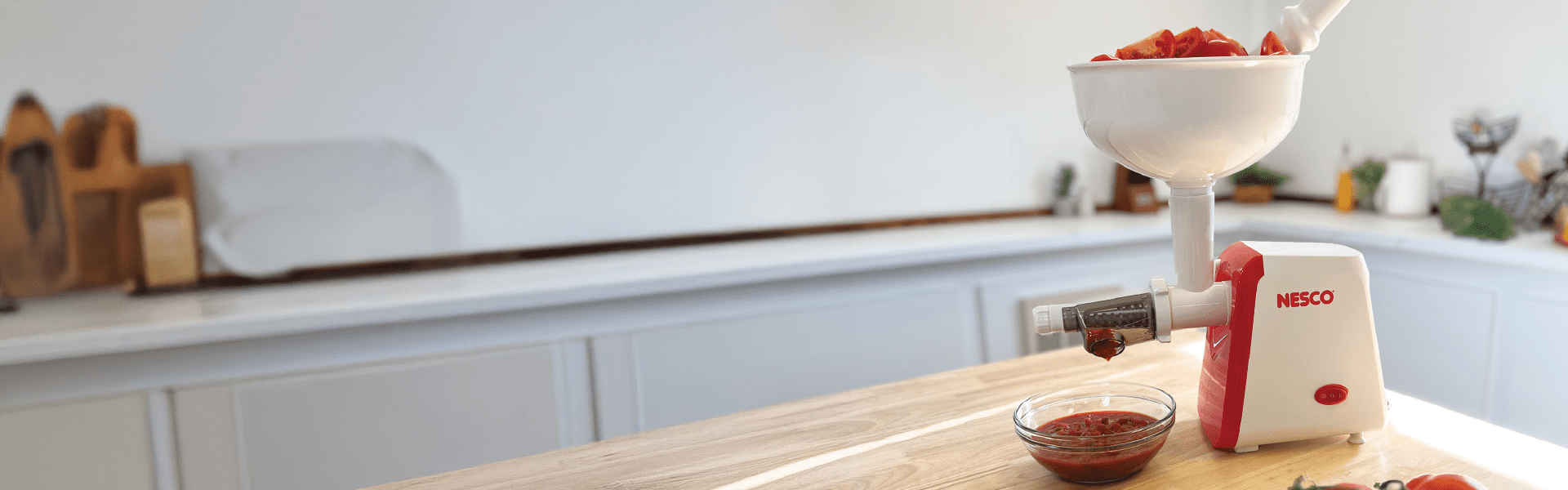 Turn tomatoes, fruits, and veggies into sauces, salsas, and purées in minutes with the NESCO Electric Food Strainer. Less prep, more preserving.