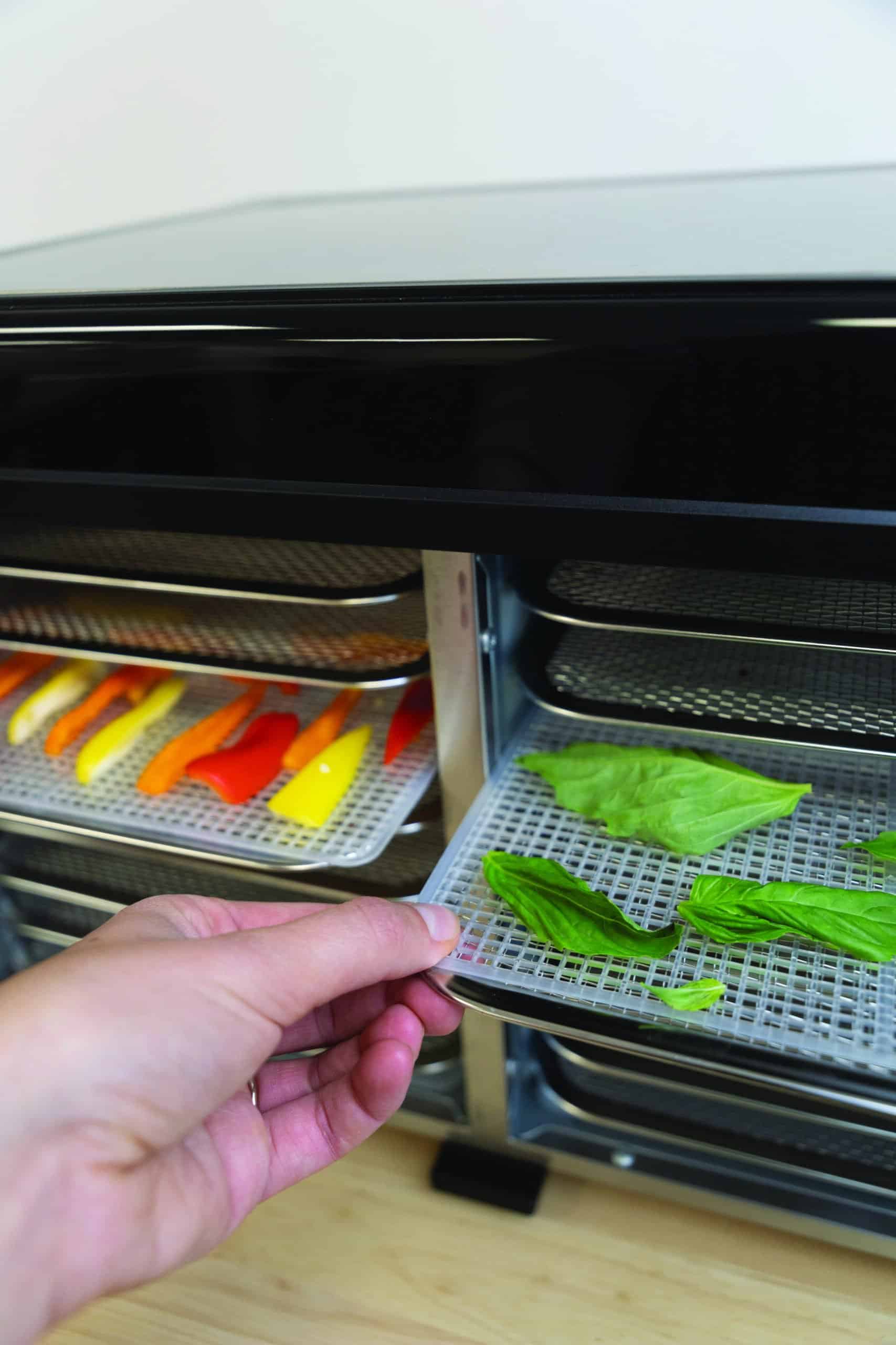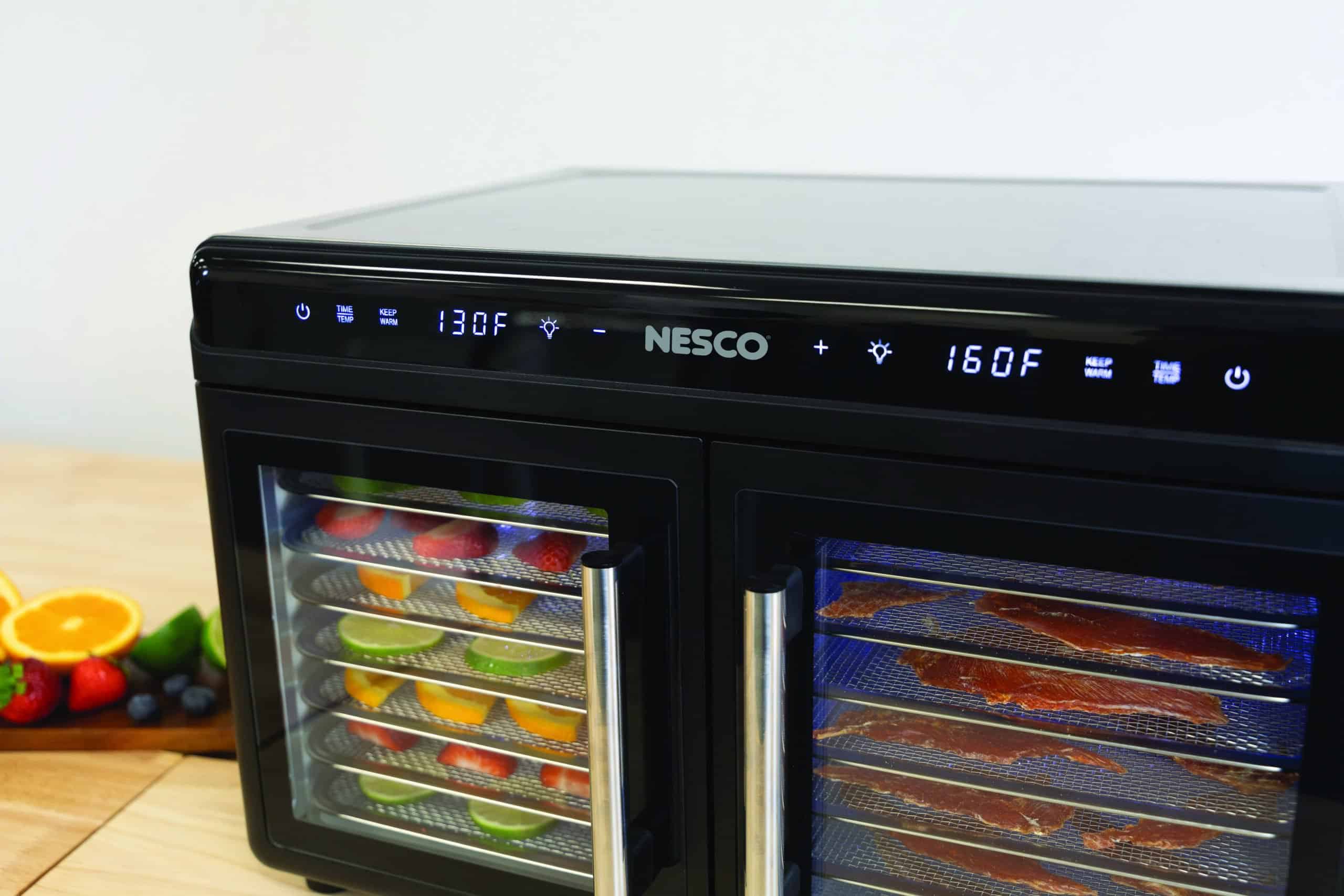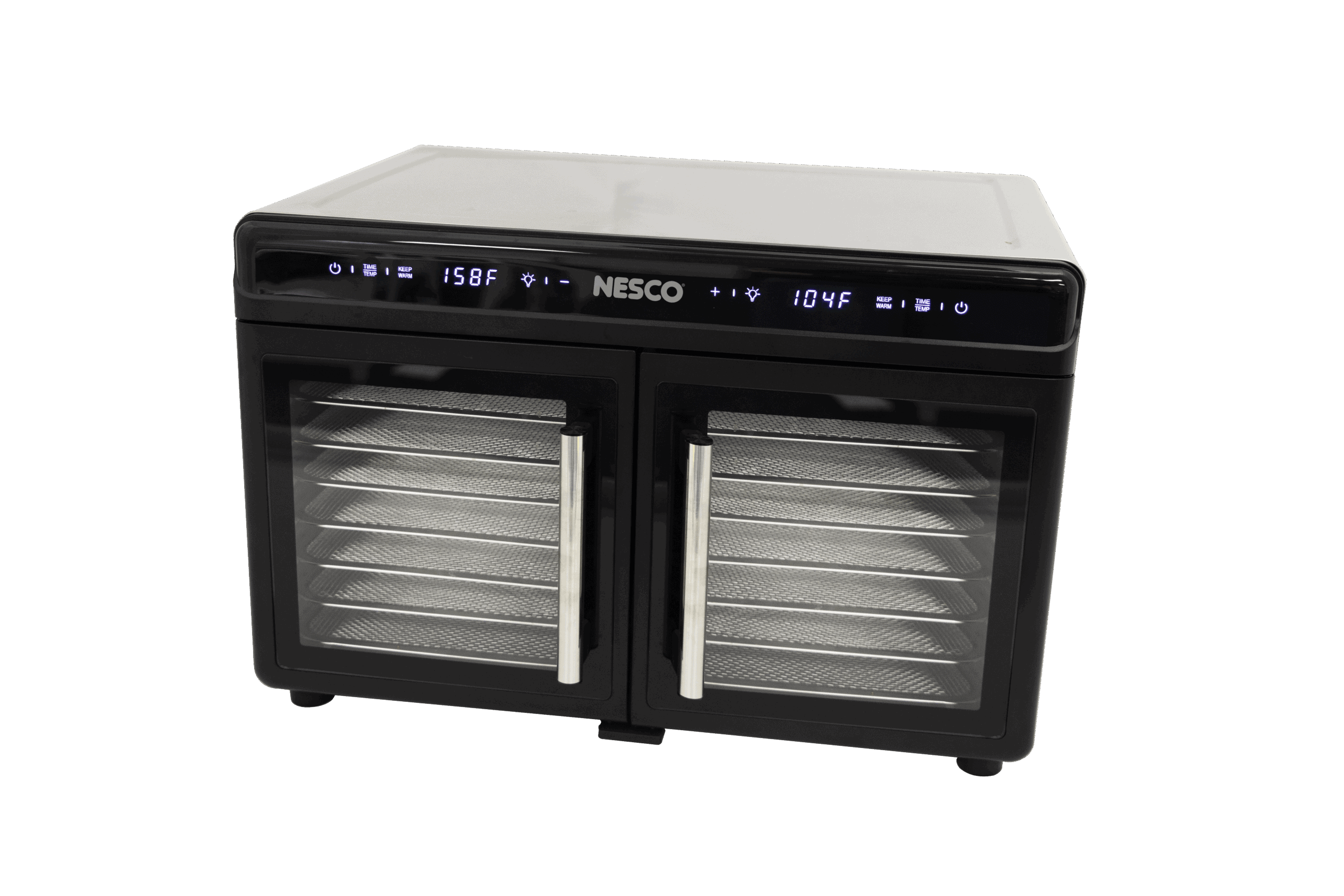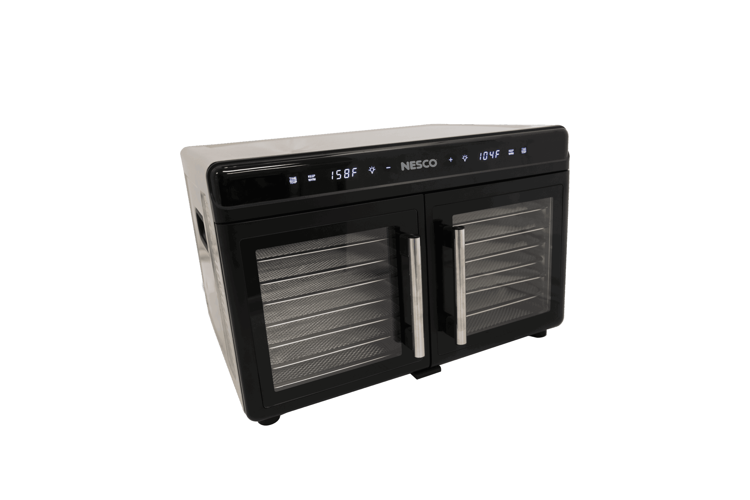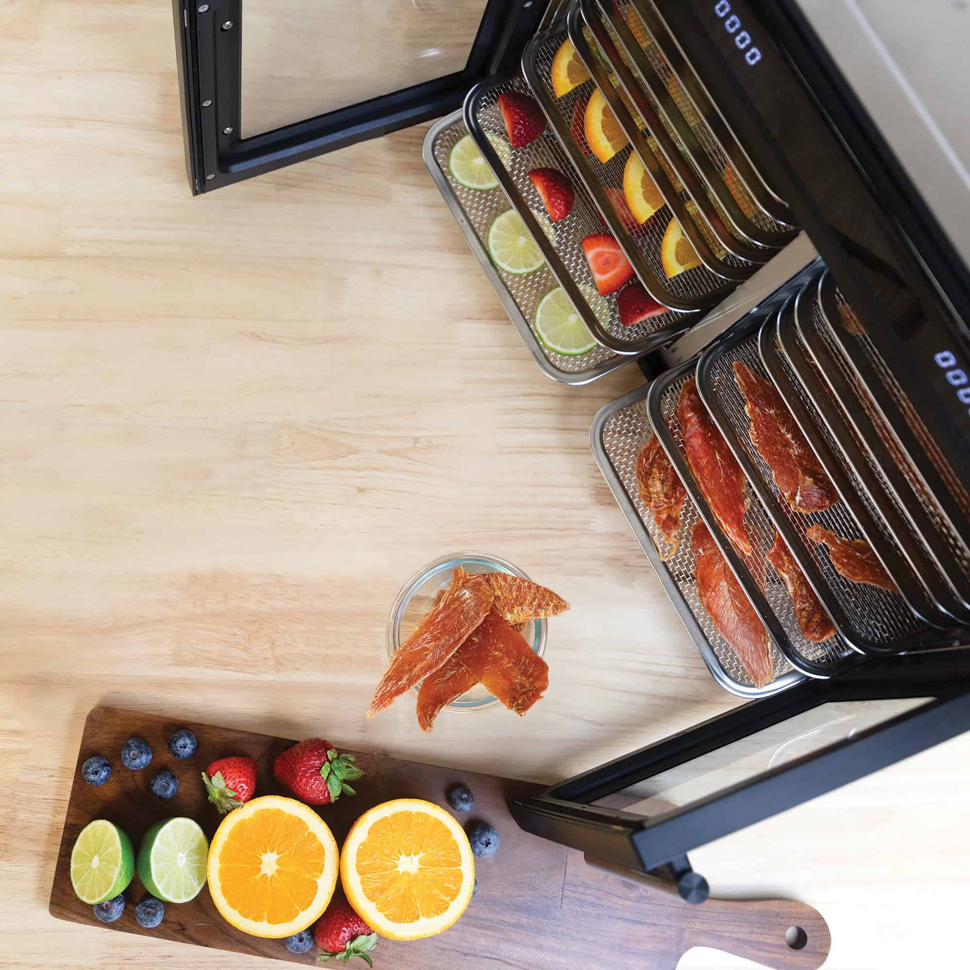 This stainless steel food dehydrator features an intuitive touch digital display with independent zone controls, a 1–24 hour timer, and adjustable temperatures from 95–160°F. With a large central fan for even heat, 16 steel mesh trays, interior lighting, and 1200 watts of drying power, it’s built for efficient, versatile drying. Includes mesh sheets for herbs and drip trays that double as fruit roll sheets.