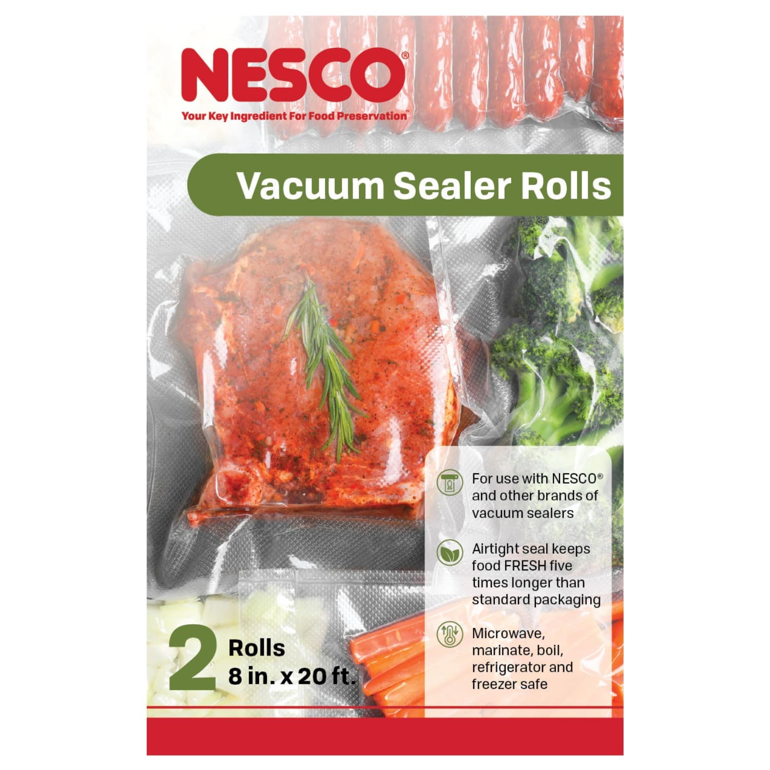 NESCO Vacuum Sealer Rolls are designed to lock freshness and flavor in and keep air, moisture and odors out. The multi-layer construction is tear-resistant and is designed to perform at extreme temperatures. Eliminate freezer burn, reduce spoilage and waste. Cross-venting channels on both sides allow for maximum air extraction and slow down traveling liquids when sealing moist foods. Material is BPA, PVC, Phthalates free and is microwave, boil, sous-vide, dishwasher and freezer safe. Can be cut and trimmed to make bags. NESCO Vacuum Sealer Rolls are ideal for keeping food fresh up to 5 times longer than traditional methods. Compatible with NESCO and other brands of vacuum sealers. NESCO Vacuum Sealer Rolls are available in various sizes.