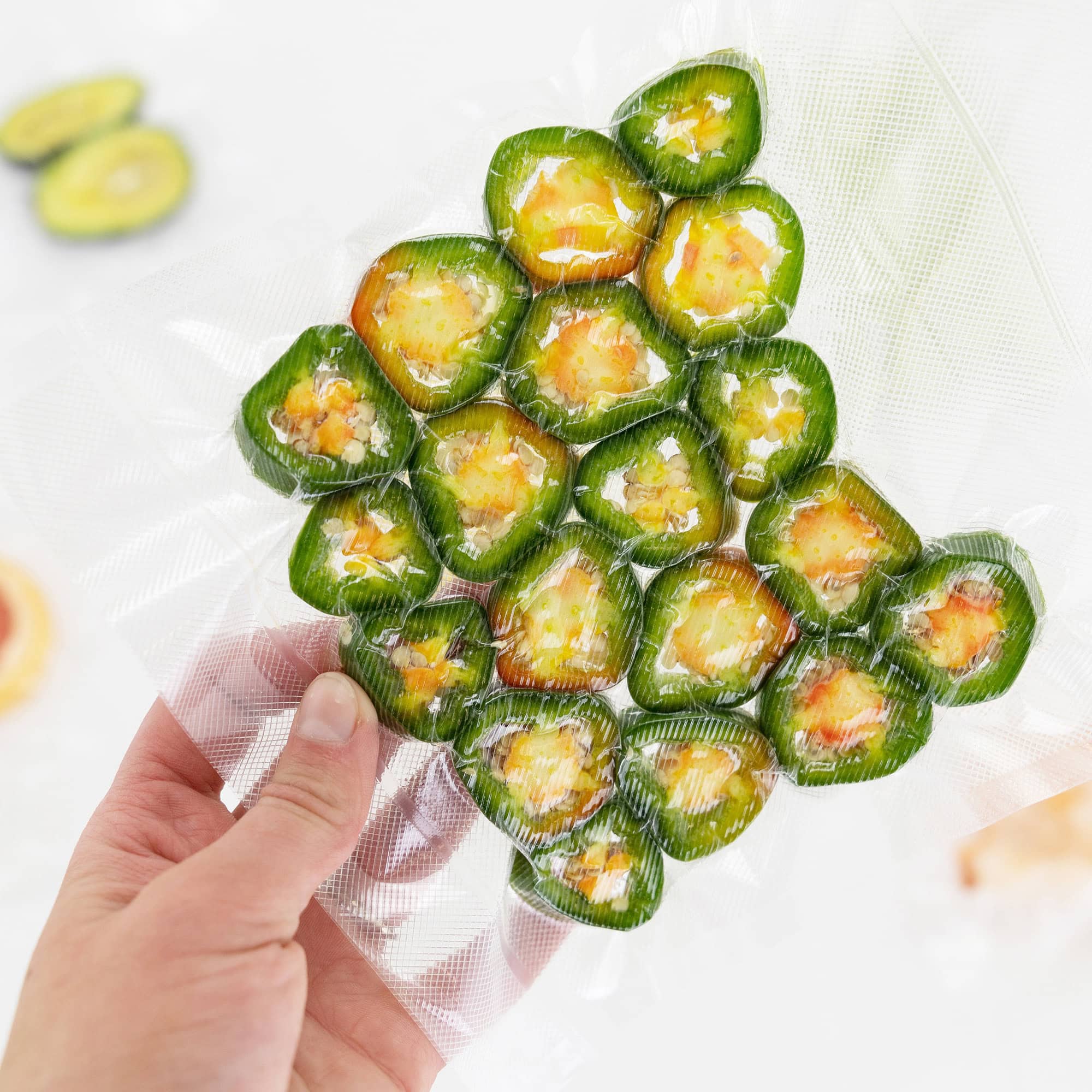 NESCO Vacuum Sealer Bags are designed to lock freshness and flavor in and keep air, moisture and odors out. The multi-layer construction is tear-resistant and is designed to perform at extreme temperatures. Eliminate freezer burn, reduce spoilage and waste. Cross-venting channels on both sides allow for maximum air extraction and slow down traveling liquids when sealing moist foods. Material is BPA, PVC, Phthalates free and is microwave, boil, sous-vide, dishwasher and freezer safe.  Pre-cut and pre-sealed on three sides for easy use. NESCO Vacuum Sealer Bags are ideal for keeping food fresh up to 5 times longer than traditional methods. Compatible with NESCO and other brands of vacuum sealers. NESCO Vacuum Sealer Bags are available in various sizes.