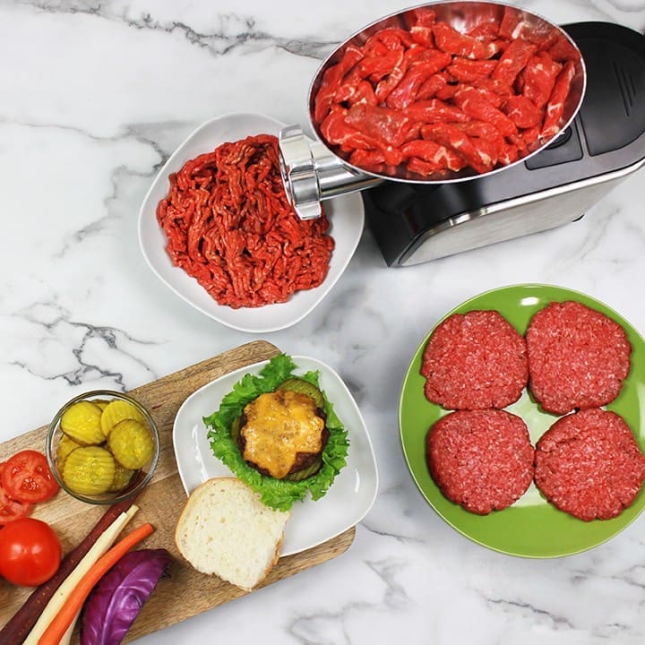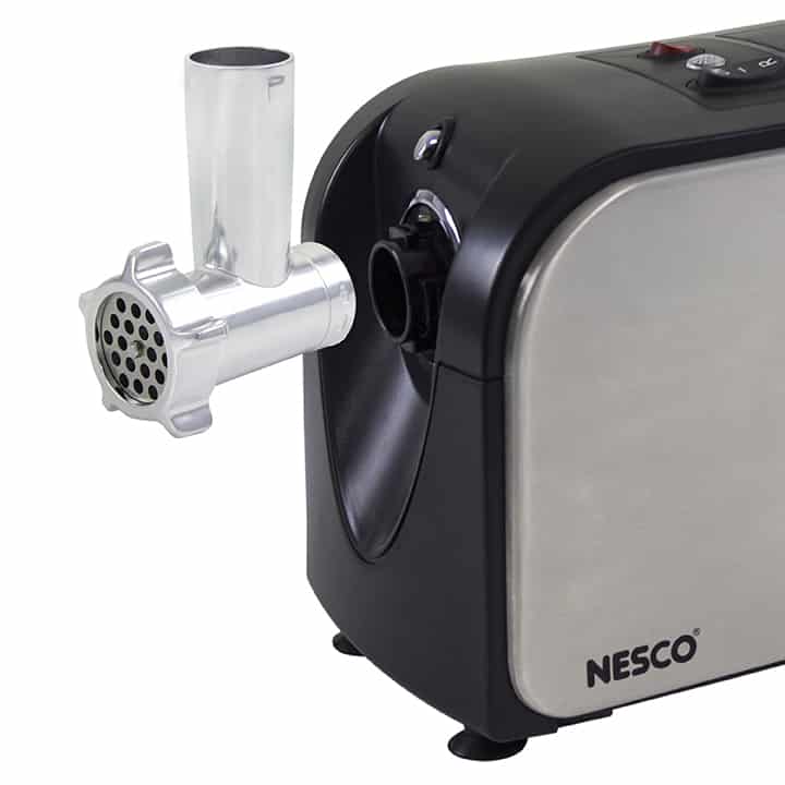 The NESCO FG-180 Food Grinder is perfect for processing wild game into sausage, hamburger and other ground meat. The 500 watt motor and die-cast hopper allow you to grind generous portions of meat in a short amount of time, quickly and efficiently. The heavy duty cutting blade and grinding plates can process up to 3 pounds of meat per minute. The three grinder plates conveniently nest inside the integrated storage area. This grinder has two speed settings, high for grinding and low for stuffing. The reverse auger function eliminates jamming and ensures continuous use, while the stable design prevents tipping. The hopper and aluminum #5 grinder head assembly are removable for easy clean up. Includes a sausage stuffing tube, two stuffing plate attachments, and a food pusher. Whether you’re processing beef for your famous family cookout or creating a sandwich spread for busy work days, the NESCO FG-180 Food Grinder provides gourmet results and puts you in control of the grind.