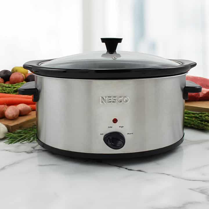 It’s easy to get dinner to the table on busy days with your NESCO 6 QT. Slow Cooker. Simply add your ingredients, choose your heat setting, and go about your day. The removable ceramic pot is both oven and refrigerator-safe making meal prep for busy weekdays a snap. The clear tempered-glass lid lets you watch the cooking process. The stay cool handles make the unit portable allowing you to bring that delicious flavor anywhere. No matter what the occasion is, the NESCO 6 QT. Slow Cooker makes time around the dinner table special.