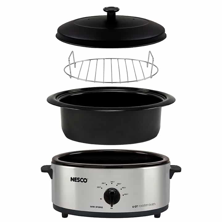 Serve up and celebrate with the NESCO 6 QT. Roaster! This versatile appliance is designed to roast, bake, cook, steam, slow cook and serve all in one. The 750 watt roaster base features “Circle of Heat” technology which provides moist and even cooking. The removable 6 quart cookwell serves up to 6 people, convenient for entertaining and small families. Whether you’re baking a ham, serving pulled pork, or slow roasting brisket, the full-range temperature control (200°F – 450°F) provides the versatility needed for a wide variety of cooking options. The durable porcelain enamel finish is easy to clean and ensures years of enjoyment. Includes a cooking rack with lift-out handles for baking and oil-free roasting. Set it to satisfy and bring that delicious flavor anywhere. The portable and convenient NESCO 6 QT. Roaster is perfect for those special occasions and on-the-go family activities.