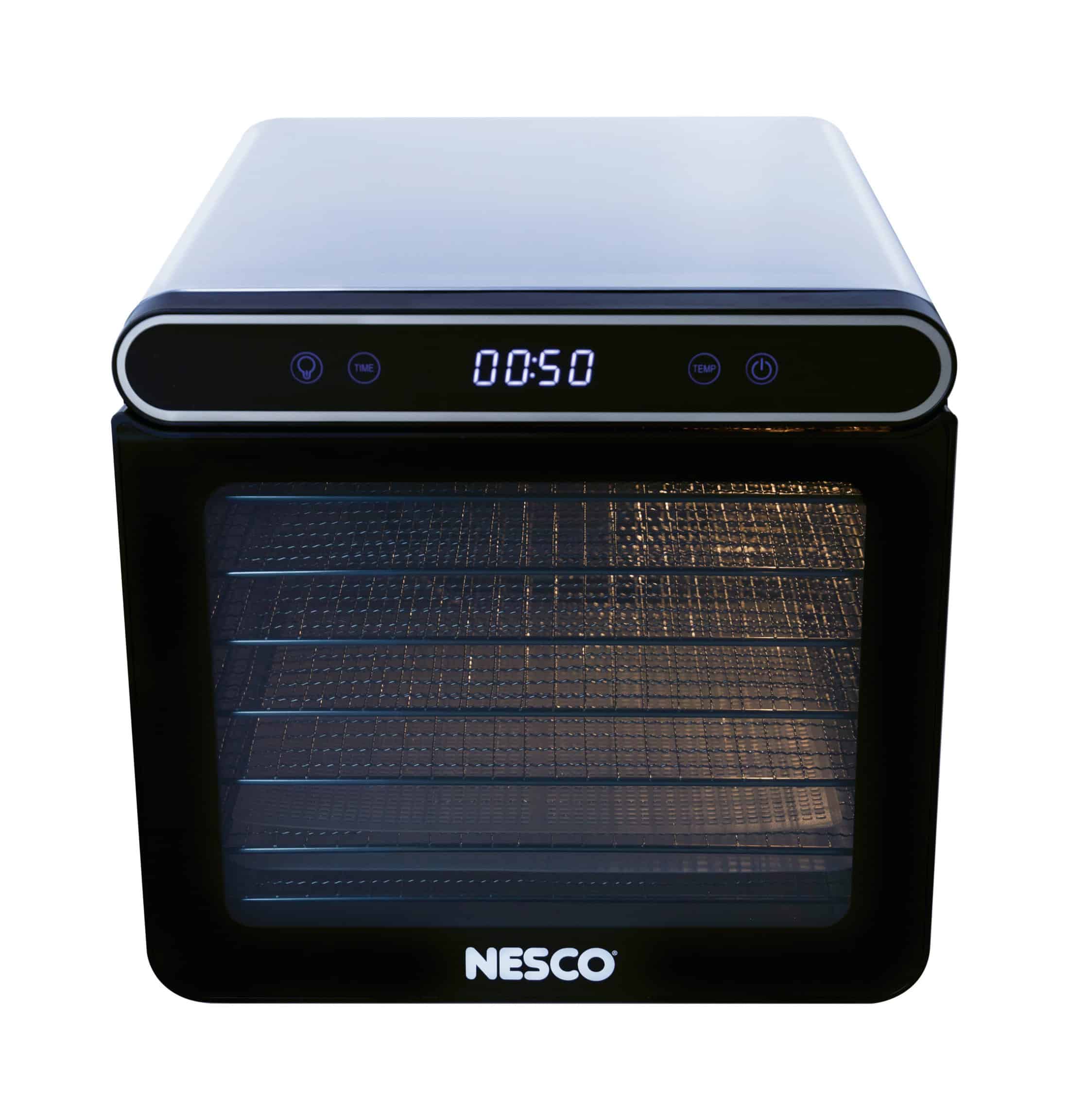 The NESCO 7 Tray Stainless Steel Digital Dehydrator is perfect for making jerky as well as dried herbs, fruits and vegetables. Seven steel mesh trays provide over 900 square inches of dehydrating space perfect for making larger batches. The oversized fan and temperature control work in conjunction to maintain precise heat, ranging from 90-160°F, ideal for everything from drying oregano to making pet treats. This dehydrator features a digital LED display with easy-to-use time and temperature controls that offer the versatility and precision needed for drying different foods. Simply pick a favorite fruit, vegetable or meat and get creative with wholesome ingredients. Large window and interior light allow the user to keep an eye on the drying process easily without opening the door; ensuring foods are quickly and evenly dehydrated for optimal results, saving time and money. Includes 1 plastic drip tray that doubles as a fruit roll sheet and 1 plastic mesh sheet for smaller items like herbs. The NESCO 7 Tray Stainless Steel Digital Dehydrator is the perfect addition to your kitchen for creating healthy homemade snacks like apple and strawberry chips that everyone will enjoy.