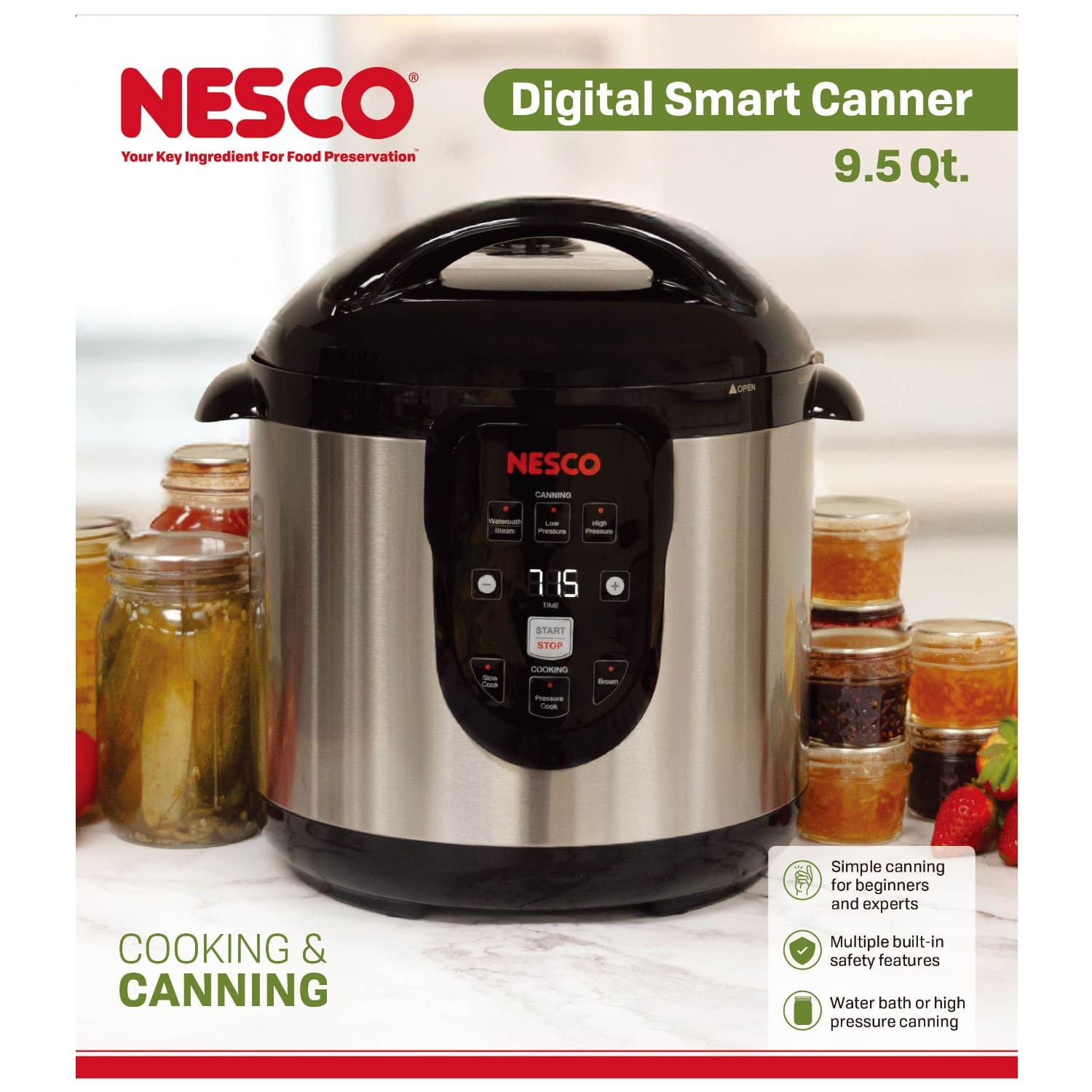 The NESCO Smart Canner & Cooker also prepares your favorite slow-cooked recipes faster and makes healthy, delicious meals with a touch of a button. Easy to clean and perfect for quick and efficient pressure/slow cooking, browning, steaming vegetables and cooking rice. Additional accessories include a canning rack and steam rack for canning and cooking options and a removable condensation catcher for easier clean up. Can the safe way with the NESCO Smart Canner & Cooker.