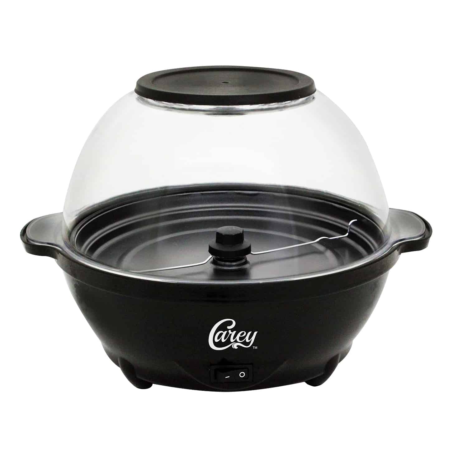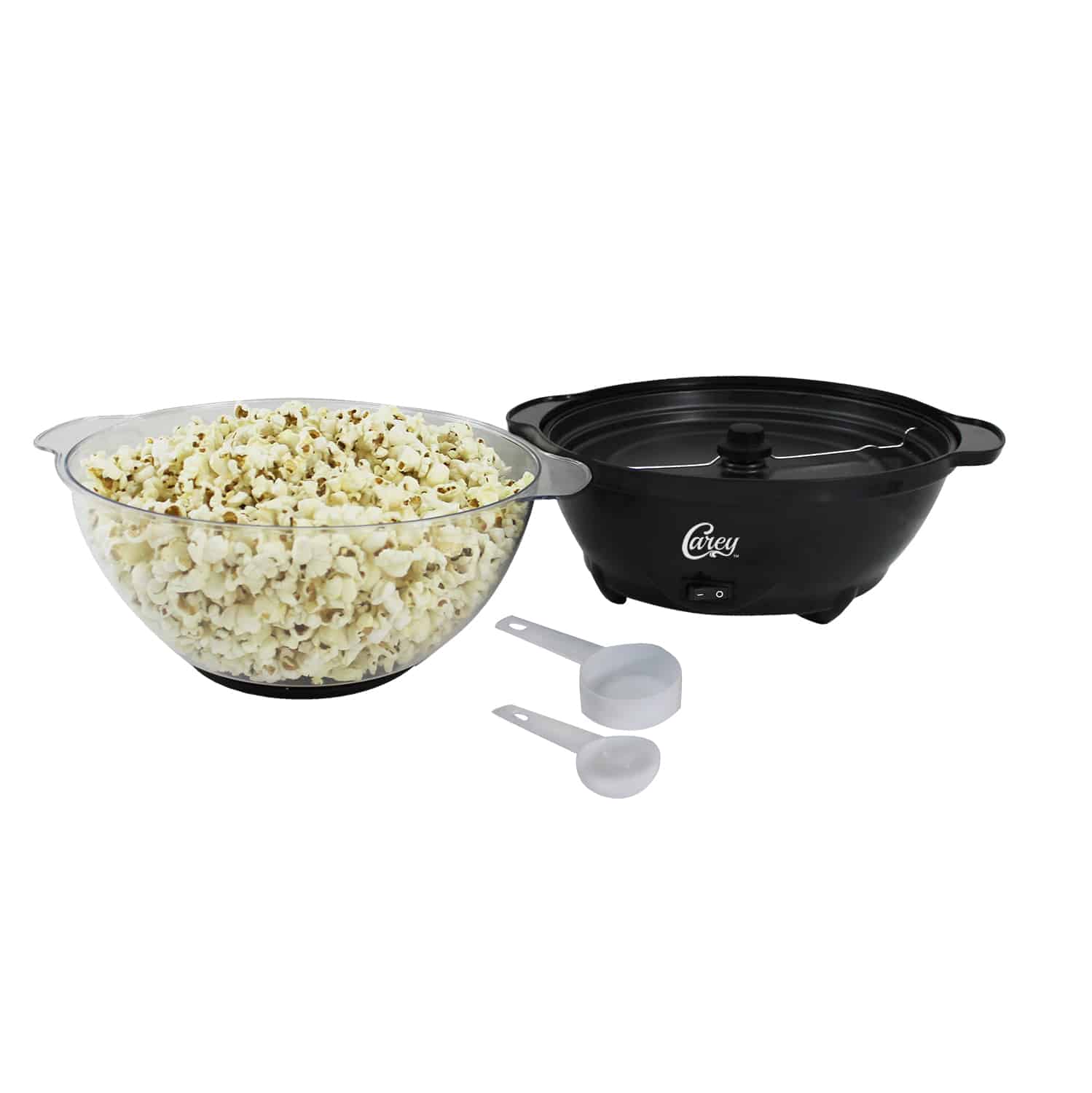 Enjoy fresh, homemade popcorn in minutes just the way you like it with the CAREY Popcorn Popper. Both fun and easy to use, the CAREY Popper is a popcorn maker and serving bowl all in one. A simple flip of the ON/OFF switch activates the heating surface and rotation of the stirring rod. The stirring rod helps to evenly coat the corn and keep it moving to ensure that all the kernels pop. The non-stick popping surface makes clean up simple and fast. The cover is vented allowing moisture to escape which keeps popcorn dry and crunchy. Want buttered popcorn? Place a small amount of butter on the cover vent and let it melt from the heat of the popper and drizzle onto the popcorn as it pops. Watch the popping progress through the clear cover that doubles as a family sized serving bowl. When popping has finished, snap the cover lid over the vent and use the side handles to flip the popper base over, the cover is now a serving bowl. The popper base rests neatly inside the serving bowl making for compact storage when not in use. Measuring cups are included to ensure the perfect amount of popped, delicious corn. Whether you are making a batch for your favorite movie or for the big game, the CAREY Popcorn Popper lets you make light, fluffy popcorn in the comfort of your own home.