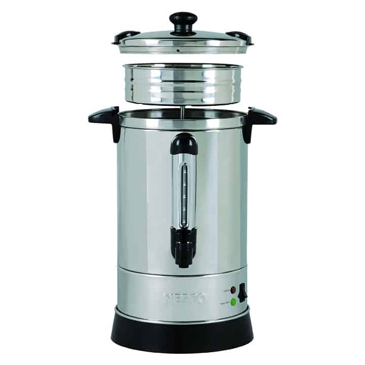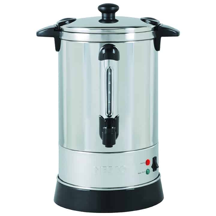 The NESCO 30 Cup Coffee Urn is perfect for large parties, business meetings or social gatherings. Its large capacity can hold up to 30, 5.7 oz. cups. Approximate brewing time is one cup per minute. The stainless steel urn base features a double insulated wall that retains heat and has a 950 watt heating element that will keep your coffee hot and fresh for hours of enjoyment. The easy-to-use dispenser & drip-free spout with continuous pouring option provides a perfectly poured cup of coffee every time. The ready-to-serve indicator light will illuminate green when coffee is ready to be poured and enjoyed. The coffee level indicator shows how much coffee is left in the urn. The stainless steel coffee basket is removable and dishwasher safe making cleanup easy and quick. Additional features include water level marks for easy filling and stay-cool handles to help prevent mishaps. The NESCO 30 Cup Coffee Urn a real crowd pleaser that keeps coffee fresh and flavorful all day long.