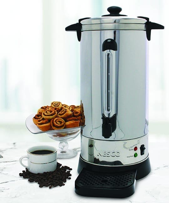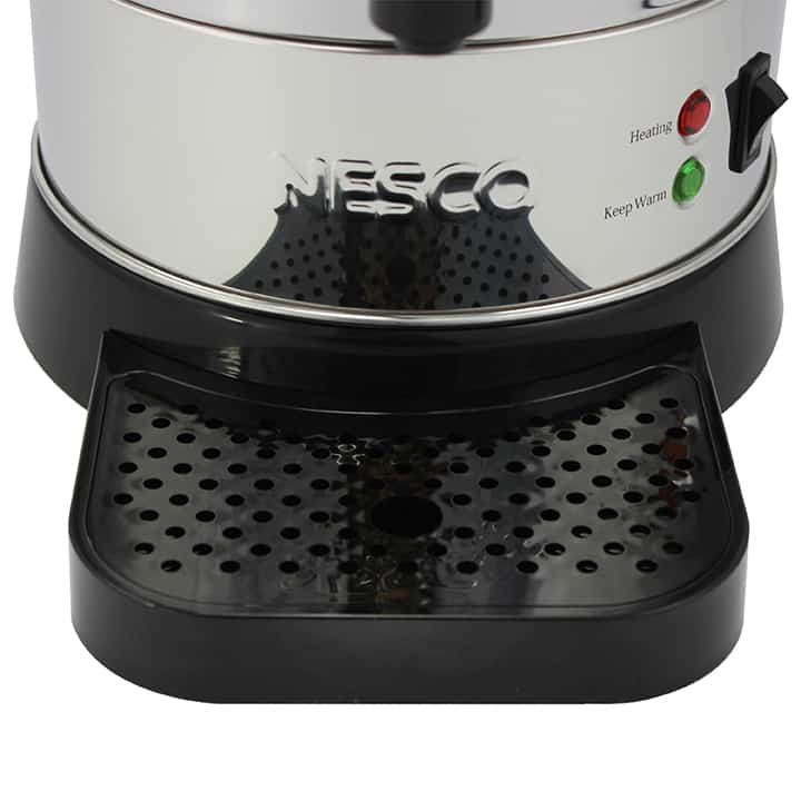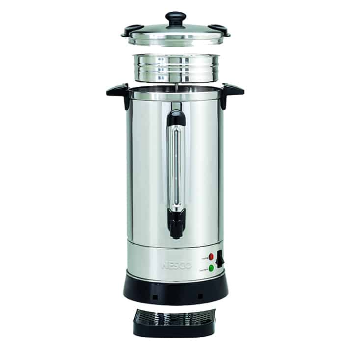 The NESCO 50 Cup Coffee Urn is perfect for large social gatherings, business meetings or family parties. Its hefty capacity can hold up to 50, 5.7 oz. cups. Approximate brewing time is one cup per minute. The stainless steel urn base features a double insulated wall that retains heat and has a 950 watt heating element that will keep your coffee hot and fresh for hours of enjoyment. The easy-to-use dispenser and drip-free spout with continuous pouring option provides a perfectly poured cup of coffee every time. The ready-to-serve indicator light will illuminate green when coffee is ready to be poured and enjoyed. The coffee level indicator visually shows how much coffee is left in the urn. A convenient drip tray collects splashes and spills ensuring a clean countertop. The stainless steel coffee basket is removable and dishwasher safe making cleanup easy and quick. Additional features include water level marks for easy filling and stay-cool handles to help prevent mishaps. The NESCO 50 Cup Coffee Urn a real crowd pleaser that keeps coffee fresh and flavorful all day long.