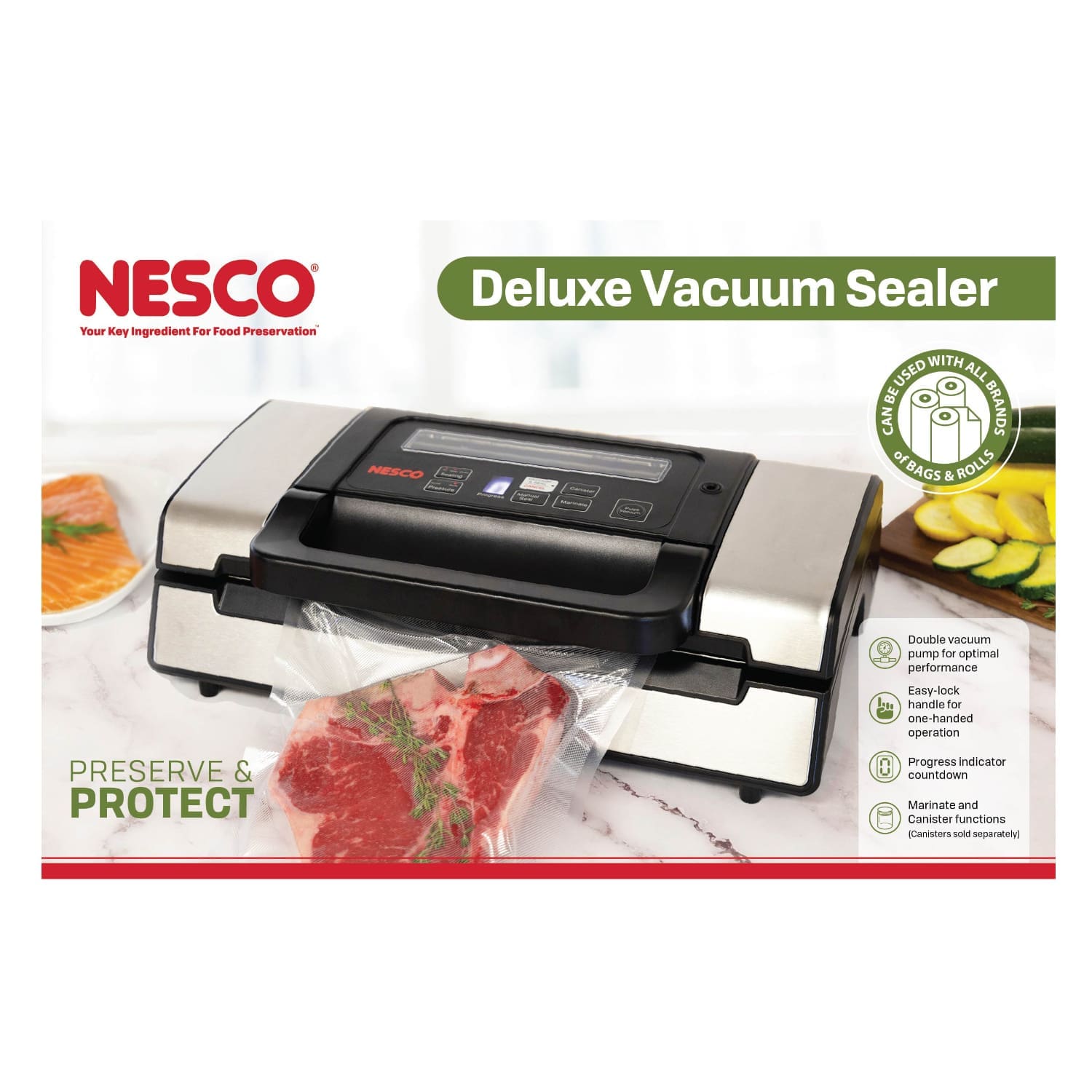 The NESCO VS-12 Deluxe Vacuum Sealer offers all the versatility and performance you could ever need from a vacuum sealer. Choose from 3 “Seal” settings—Dry, Moist, and Double— then choose your vacuum pressure—Normal or Gentle—to keep softer foods safe. For delicate items like pastries, buns or cut produce, the pulse vacuum function lets the user control the suction. This sealer features a 130-Watt double vacuum pump that ensures maximum air extraction when sealing larger food items and optional double heat seals for added strength and security when sealing liquid-based or moist foods. The easy-lock handle makes one-handed operation smooth and easy. The built-in bag cutter and roll storage compartment with clear viewing window make this an all-in-one stop for keeping food fresh up to 5 times longer than traditional methods. This sealer can accommodate up to an 11.8” width bag providing the versatility needed for a wide range of sealing jobs. Two rolls are included to get you started, one 8.6” x 9.85’ roll and one 11.8”x 9.85′ roll. The NESCO VS-12 Deluxe Vacuum Sealer is compatible with any brand of vacuum sealer bags.