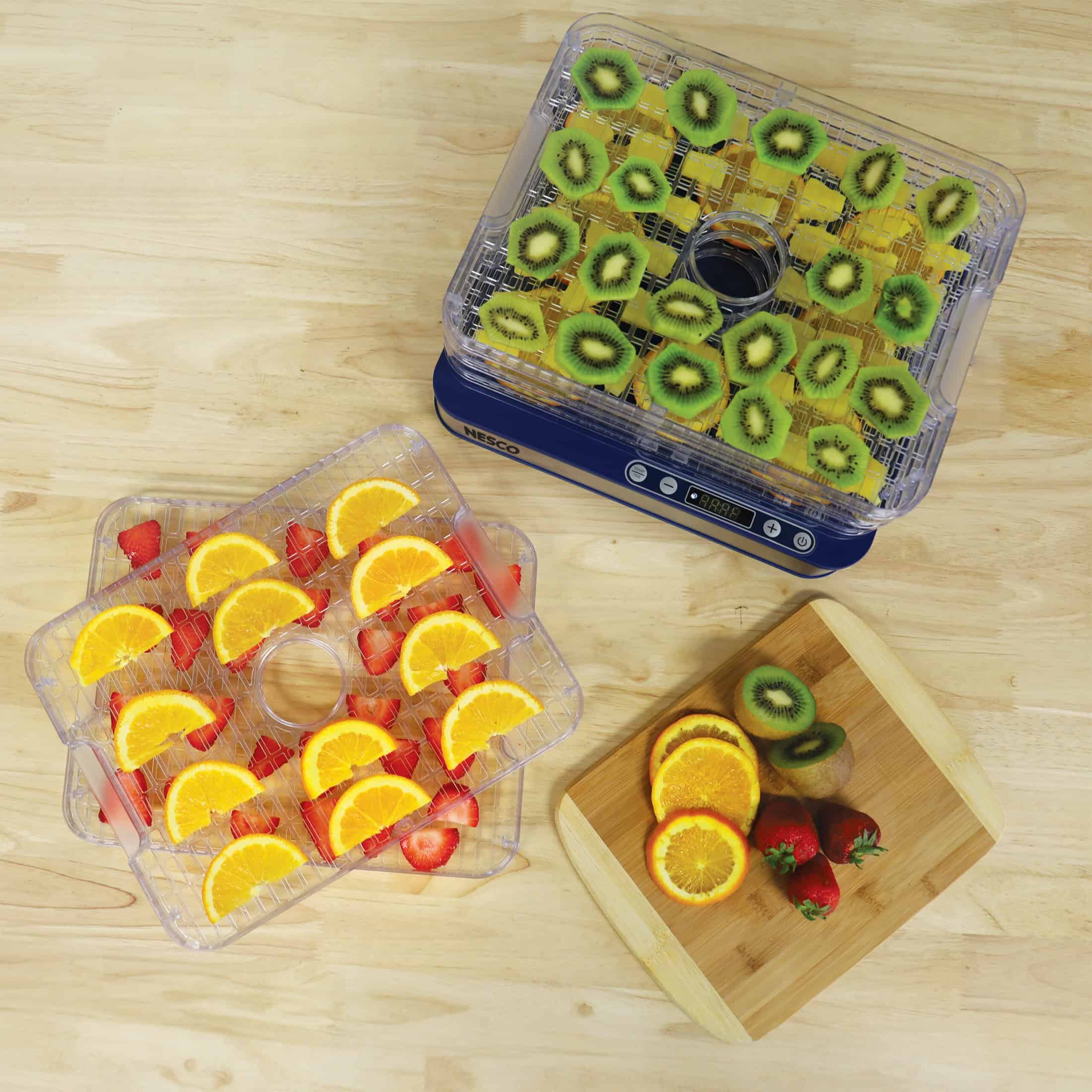 When it comes to serious dehydration needs, NESCO dehydrators are your top choice. Its sleek look and quiet operation allow you to display it in your kitchen for easy access. The bottom mounted fan ensures uniform heat distribution. The digital control panel allows temperature adjustment between 95°-158°F and set the timer in half hour increments ranging from one to 24 hours. Includes 5 clear trays measuring 12.5” x 10.75” for a total of 672 square inches of drying space with a compact, foldable tray design. The full transparent view allows you to monitor the drying process.