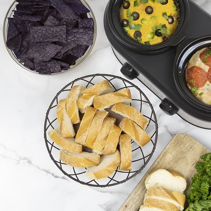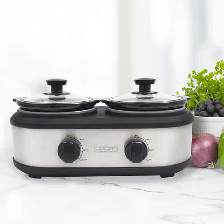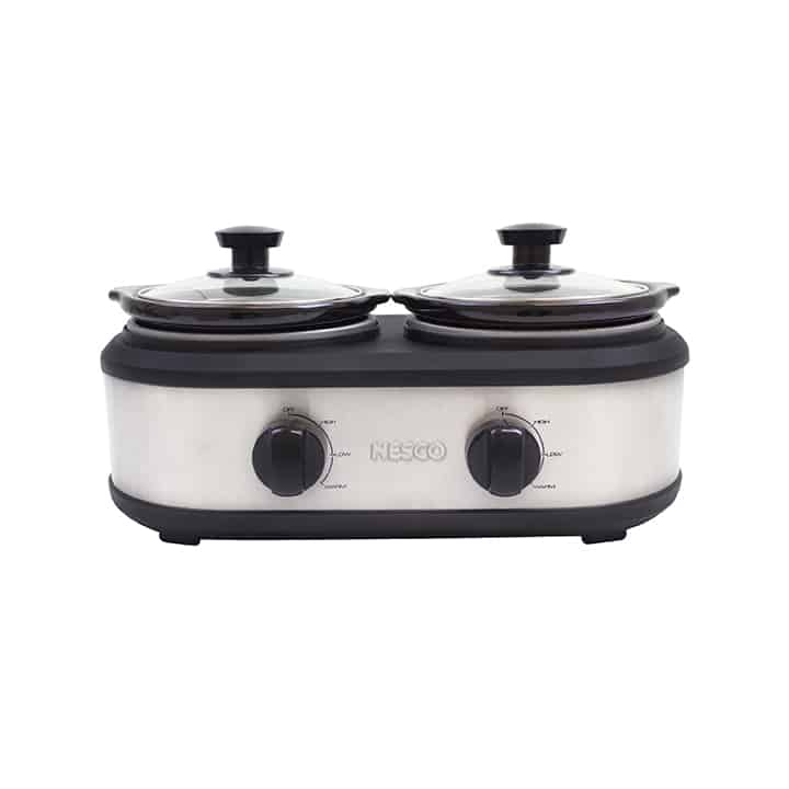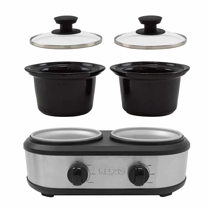 The NESCO Dual Serving Station is designed for serving two dishes at meals and special gatherings. Compact and easy to use, this slow cooker comes with two 1.25 qt. sized ceramic pots for a total cooking capacity of 2.5 qts. The cooking pots are removable and lift out of the slow cooker for tableside serving and easy cleaning. Tempered glass lids add a touch of convenience and make it easy to monitor the cooking progress. Separate control dials provide three heat settings (High, Low, Warm) for each cooking pot. Perfect for a wide range of appetizers, dips or even tacos! Keep pork verde on one side, beans and rice on the other. The NESCO Dual Serving Station keeps food hot and organized when you are creating your favorite dishes.