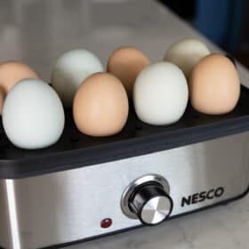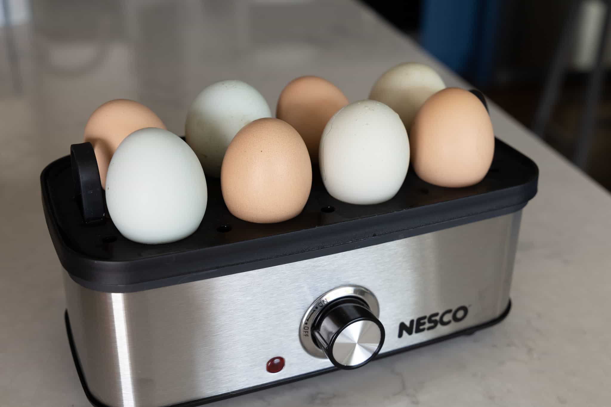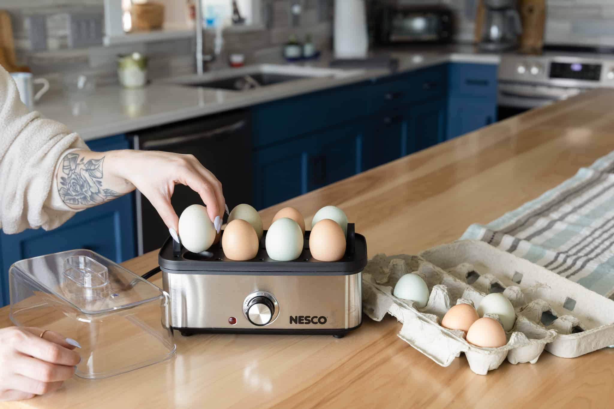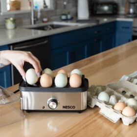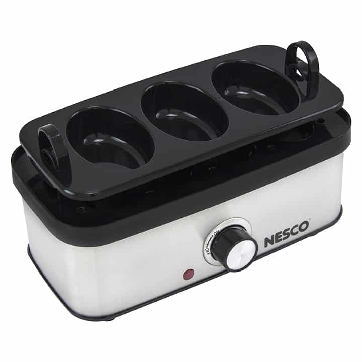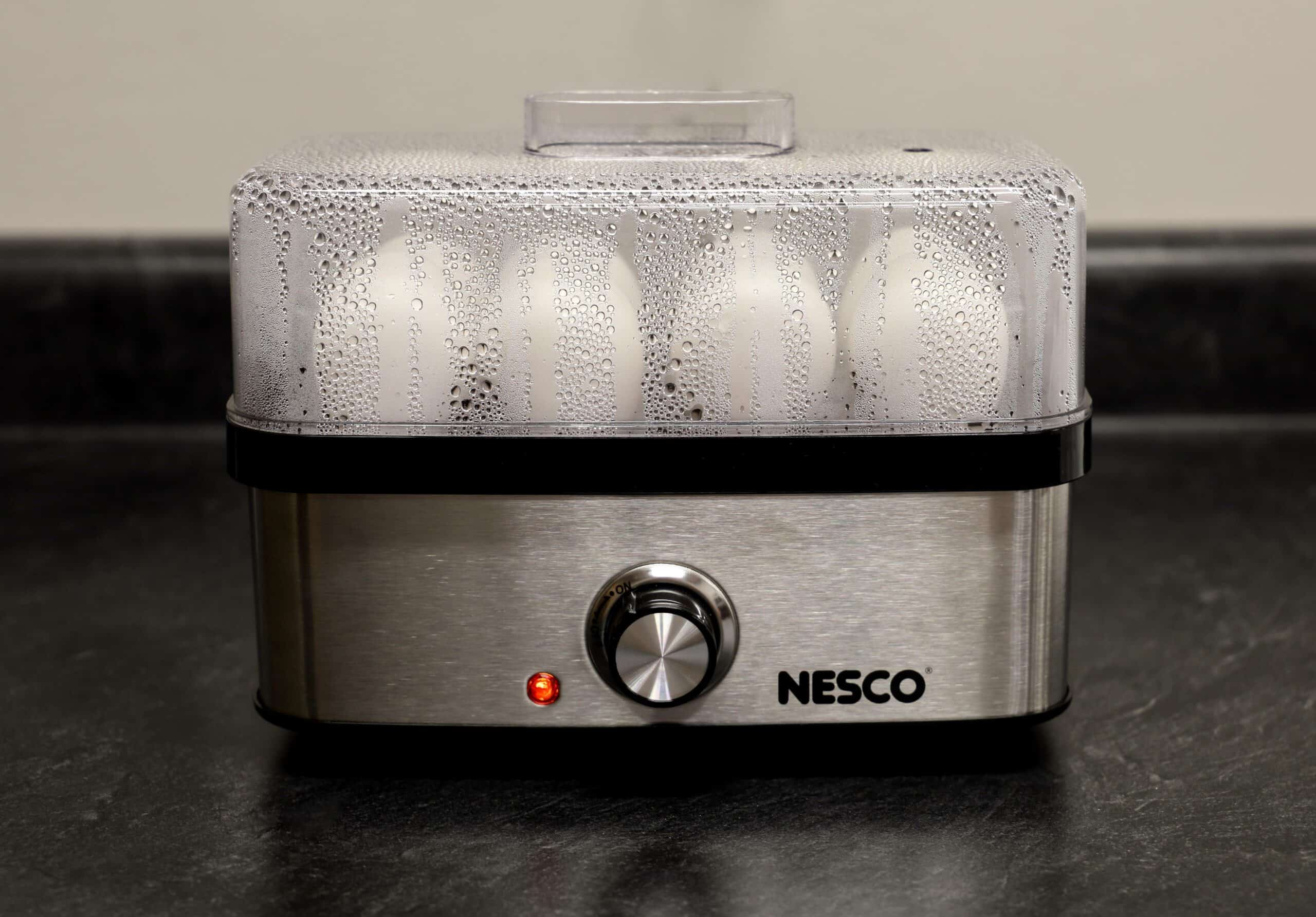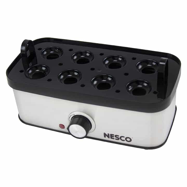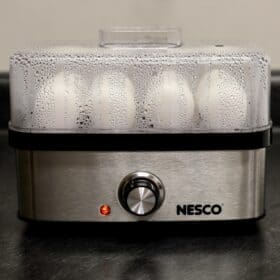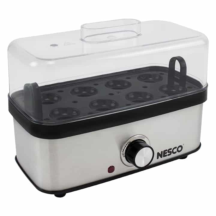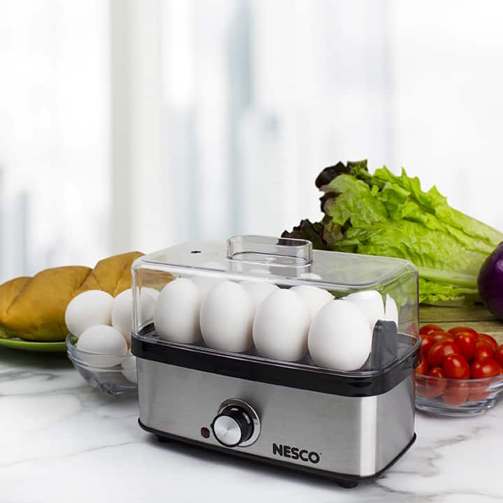The NESCO EC-10 Deluxe Egg Cooker allows you to cook up to 8 eggs to hard, medium or soft-boiled consistency in minutes! You will never have to wonder if your eggs are done. Simply use the piercing pin to puncture the eggs, add the proper amount of water to the heating base, turn on the egg cooker, and wait for the auto shut-off alarm to sound. Ideal for deviled eggs, egg salad, or poached eggs for Eggs Benedict. The measuring cup with piercing pin prevents shells from cracking and ensures perfect eggs every time. The egg cooking tray hold up to 8 eggs and the poaching tray allows you to poach up to 3 eggs at a time. The indicator light illuminates when the eggs are cooking and the auto shut-off alarm sounds when cooking is complete. This cooker features an attractive and stylish stainless-steel wrap. All non-electrical components are BPA free & dishwasher safe. The NESCO EC-10 Deluxe Egg Cooker holds up to 8 eggs which is perfect for breakfast, family meals, or high-protein snacks.