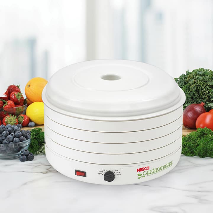 The NESCO FD-1010 Gardenmaster Pro Dehydrator is our top of the line unit-more powerful and larger than any other. 1000 watts of drying power means you can dry more, faster. This dehydrator comes with four (15 1/2″ diameter) trays and expands up to 30 trays so you can dry large quantities at once, with no tray rotation needed. Additional Add-A-Trays sold separately. The adjustable temperature control (95°F -160°F) gives you the flexibility to achieve the best results when drying different foods that need varying temperature settings. The quiet, powerful Converga-Flow® fan forces heated air up the exterior pressurized chamber, then horizontally across each individual tray. The air flow then converges in the center for quick, consistent drying that is four times faster than other dehydrators. The NESCO FD-1010 Gardenmaster Pro Dehydrator provides the drying power that generates maximum speed and quality for dehydrating your favorite fruits, vegetables, herbs and jerky.