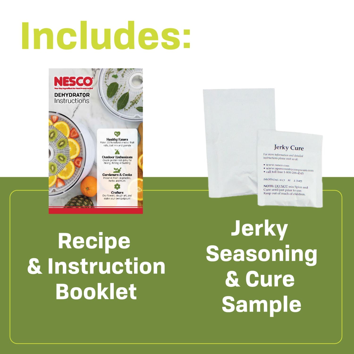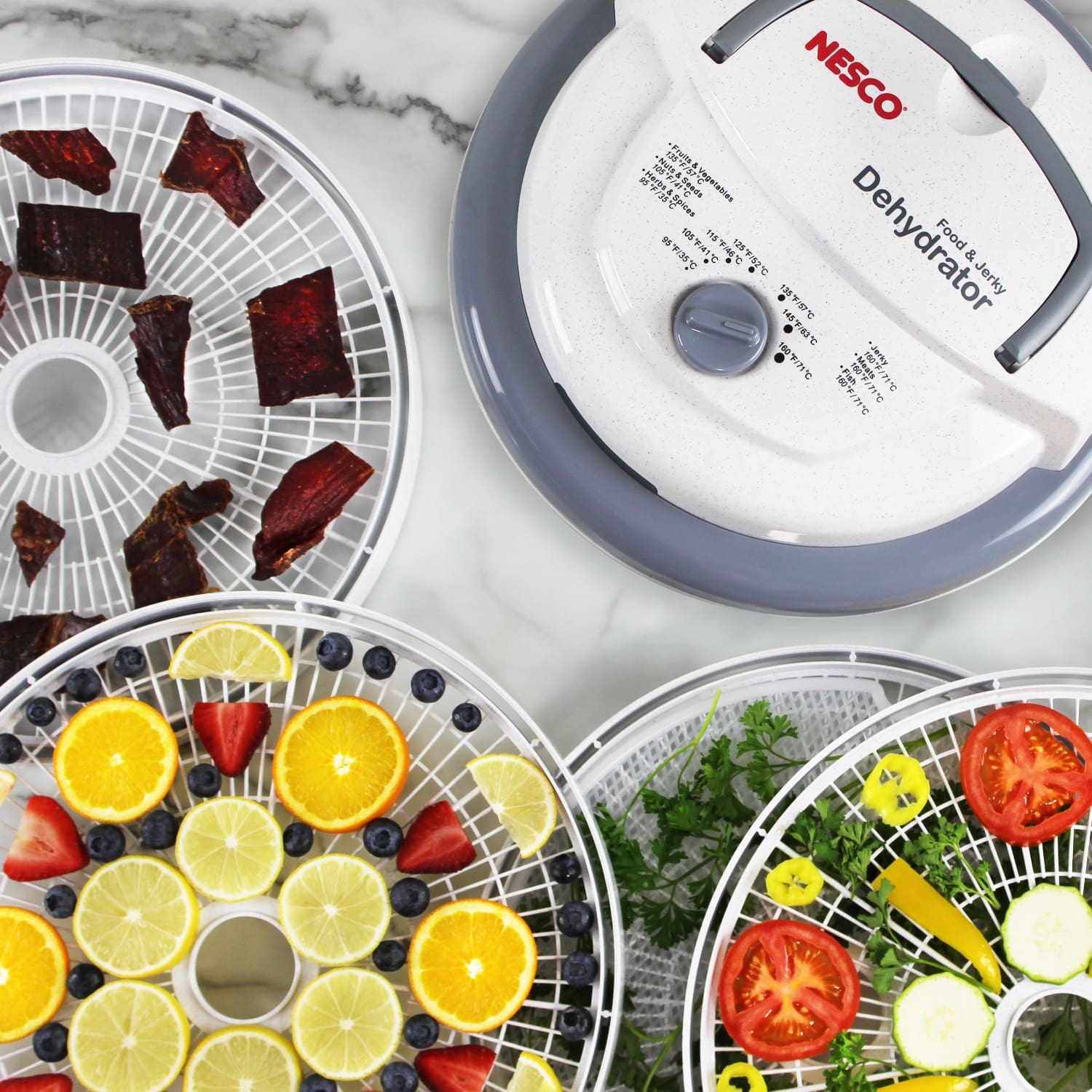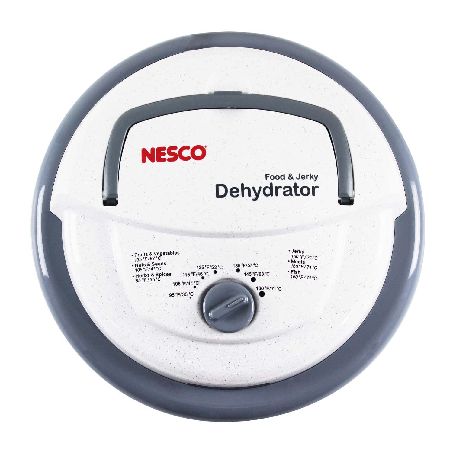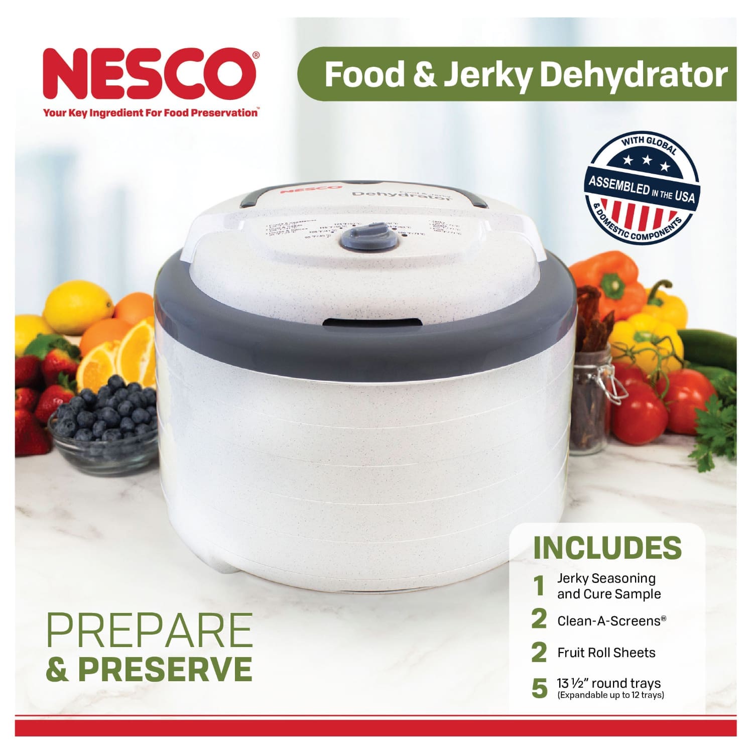 The NESCO FD-75PR Food & Jerky Dehydrator provides maximum speed and quality for dehydrating your favorite foods. The adjustable temperature control (95°F -160°F) gives you the flexibility to achieve the best results when drying different foods that need varying temperature settings. This dehydrator comes with five (13 1/2″ diameter) trays and expands up to 12 trays so you can dry large quantities at once, with no tray rotation needed. Additional Add-A-Trays sold separately. The quiet, powerful Converga-Flow® fan forces heated air down the exterior pressurized chamber, then horizontally across each individual tray. The air flow then converges in the center for quick, consistent drying that is four times faster than other dehydrators. The top mounted fan eliminates liquids dripping into the heater chamber. Includes two fruit roll sheets, two clean-a-screens, a sample of jerky seasoning & cure, and a 52-page recipe & instruction book. Make delicious jerky, fruit chips, dried herbs at a fraction of the cost of store bought. The NESCO FD-75PR Food & Jerky Dehydrator ensures even drying from top to bottom offering perfect results.