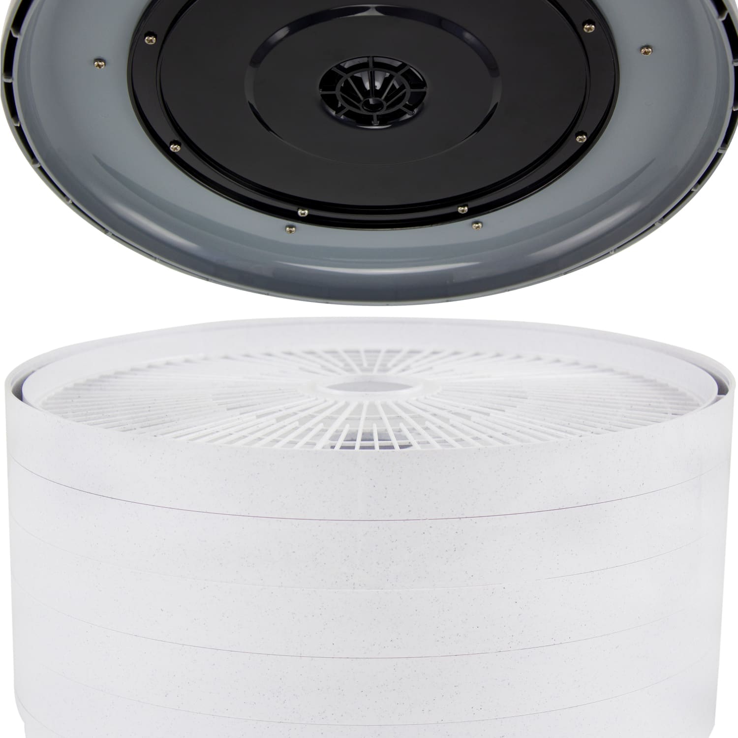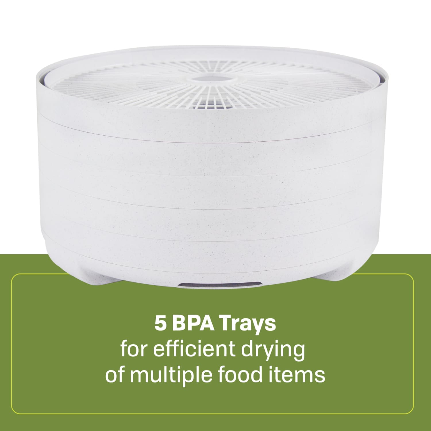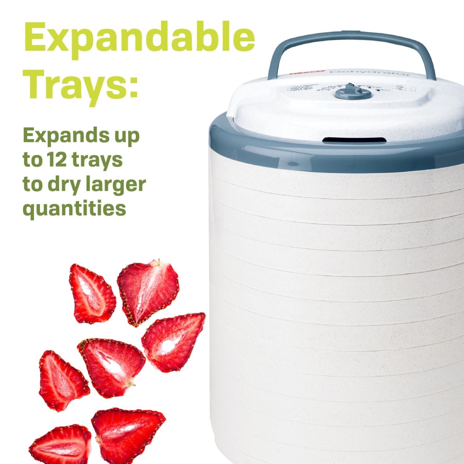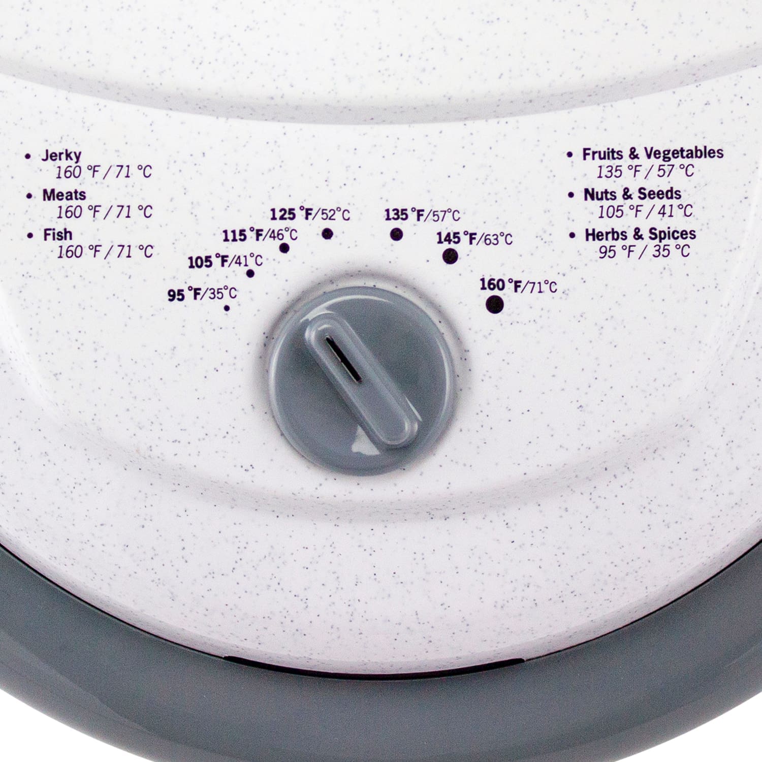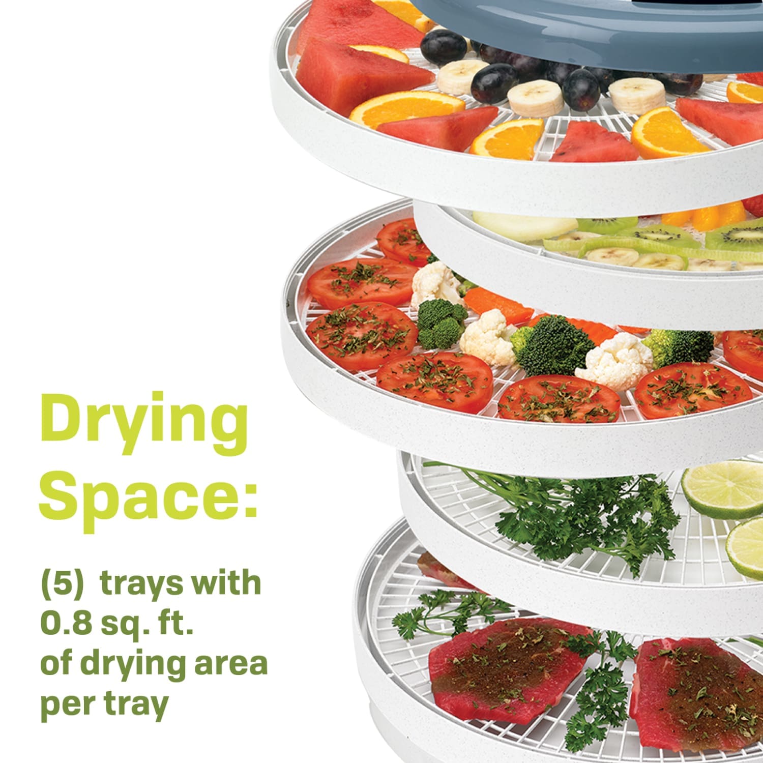 The NESCO FD-75PR Food & Jerky Dehydrator provides maximum speed and quality for dehydrating your favorite foods. The adjustable temperature control (95°F -160°F) gives you the flexibility to achieve the best results when drying different foods that need varying temperature settings. This dehydrator comes with five (13 1/2″ diameter) trays and expands up to 12 trays so you can dry large quantities at once, with no tray rotation needed. Additional Add-A-Trays sold separately. The quiet, powerful Converga-Flow® fan forces heated air down the exterior pressurized chamber, then horizontally across each individual tray. The air flow then converges in the center for quick, consistent drying that is four times faster than other dehydrators. The top mounted fan eliminates liquids dripping into the heater chamber. Includes two fruit roll sheets, two clean-a-screens, a sample of jerky seasoning & cure, and a 52-page recipe & instruction book. Make delicious jerky, fruit chips, dried herbs at a fraction of the cost of store bought. The NESCO FD-75PR Food & Jerky Dehydrator ensures even drying from top to bottom offering perfect results.