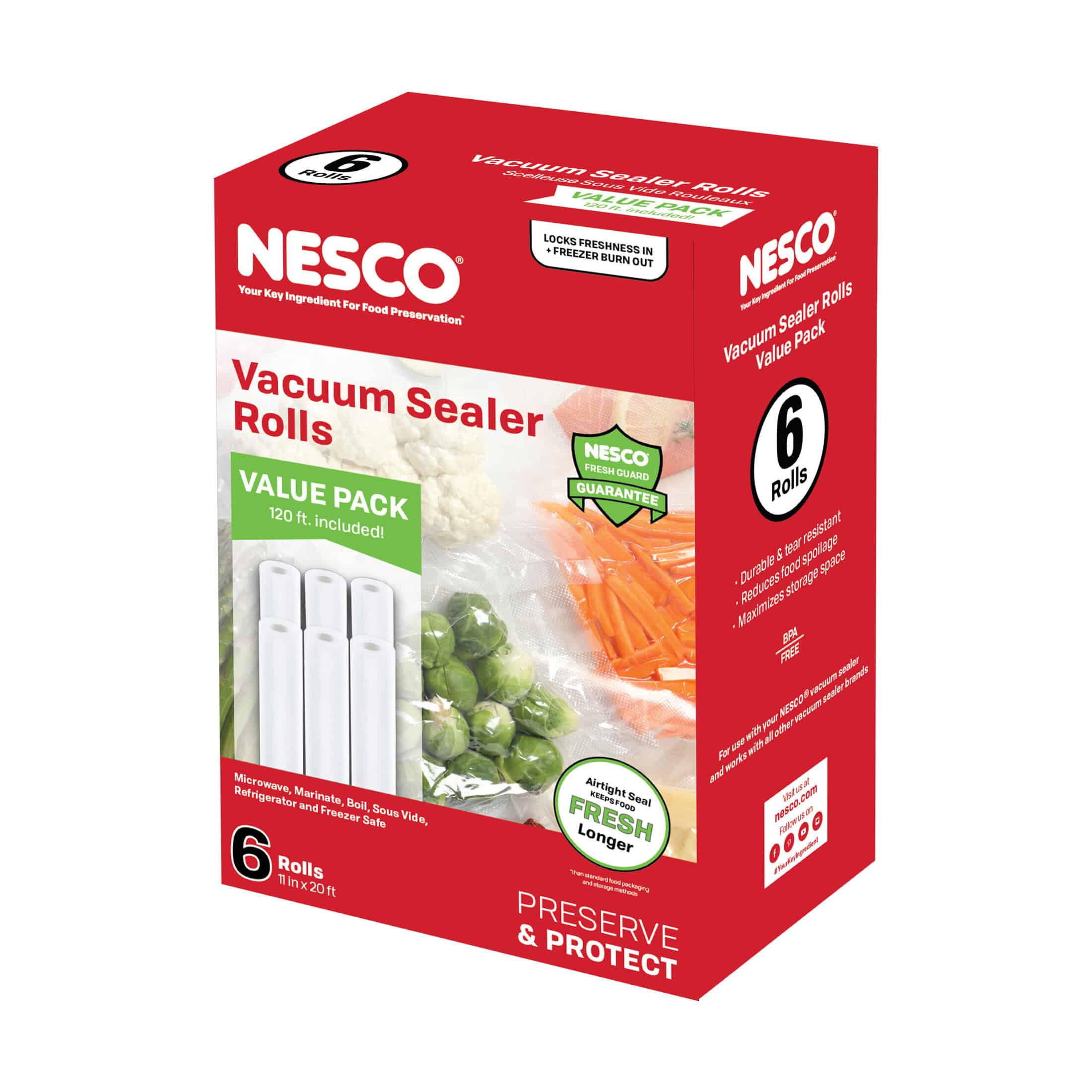 NESCO® Vacuum Sealer Rolls can be trimmed to make custom-sized bags. The material is designed to lock freshness and flavor in and keep air, moisture, and odors out. The multi-layer construction is tear-resistant and is designed to perform at extreme temperatures. Eliminate freezer burn and food waste. Cross-venting channels on both sides allow for maximum air extraction and slow down traveling liquids when sealing moist foods. Material is BPA-free, PVC-free, Phthalates-free and is microwave, boil, sous-vide, dishwasher and freezer safe. NESCO® Vacuum Sealer Rolls are ideal for keeping food fresh up to five times longer than traditional methods. Compatible with NESCO® and other brands of vacuum sealers.