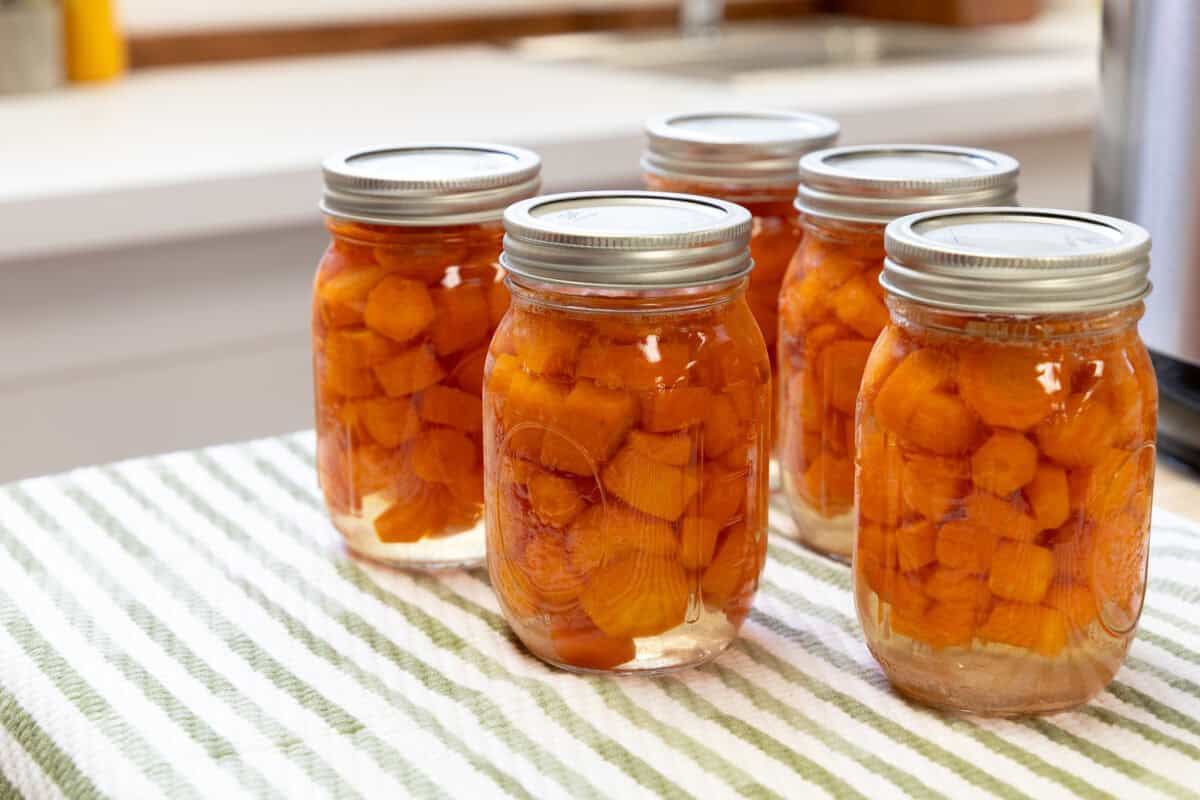 - Ladle boiling water over the carrots in each jar, still maintaining 1 inch of headspace.