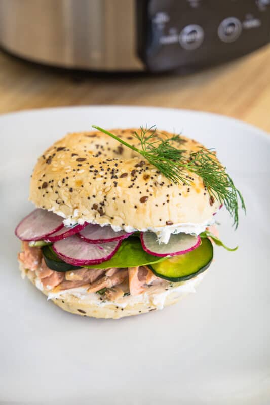 This Salmon Bagel Sandwich is made with slow-cooked salmon, and it’s combined with a seasoned cream cheese on a chewy bagel.