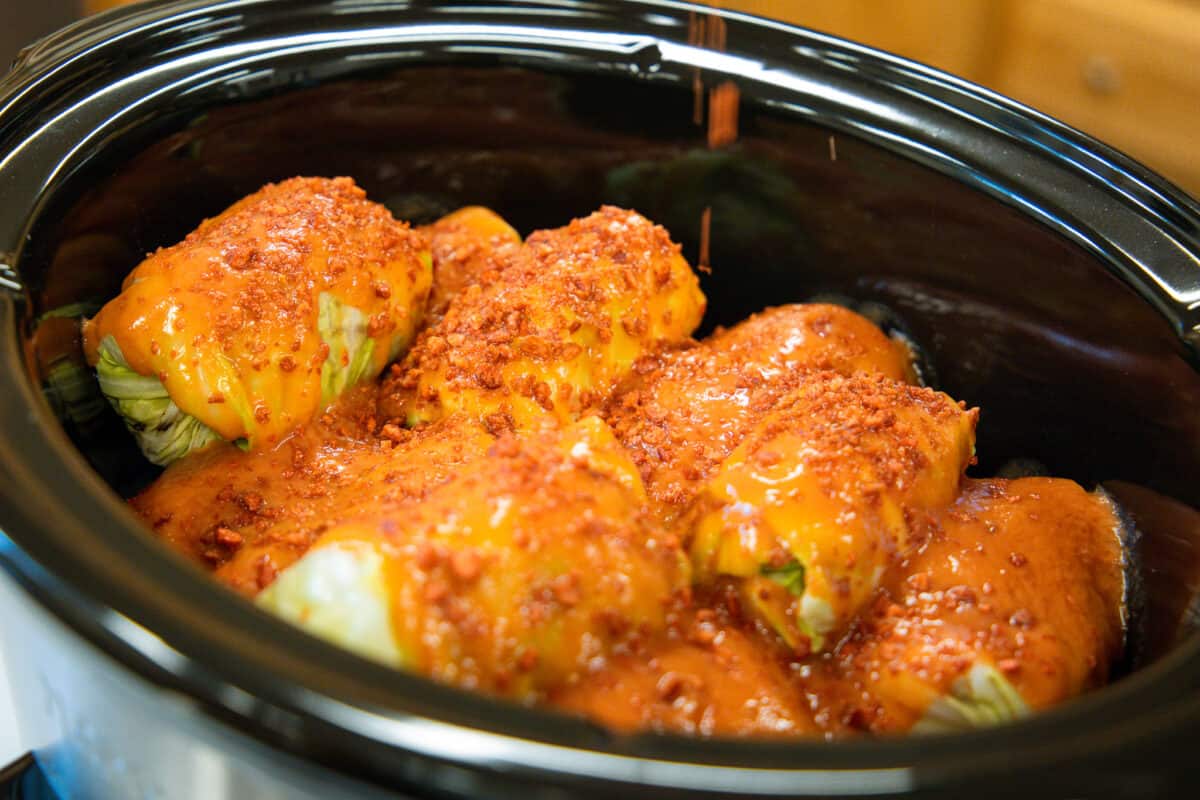 - Pour the sauce over the cabbage rolls. Add bacon on top. Cook on low for 7-8 hours or on high for 4-5 hours, until the meat is cooked through. The filling should reach 160 degrees F.